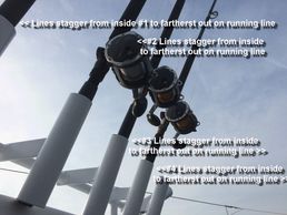 Trolling with Boards Boards are used to target fish that are in the top 25 ft of the water column. They are not designed for running deep lines. Generally trolling in the Bay consists of using Umbrella rigs with Parachutes. Bucktail rigs and double rigged rubber lures, Tsunami’s, Storms etc. These all work well with Boards and should not require any weight. Spoons can be used on Boards, but due to spoon design, tangles may occur if mixed with other lures.. When attached to the Boards, my trolling rigs are about 20 feet apart and start at about 40-50 feet from the boat. Always work your lines from the outside in. The rods farthest out go in your top position in the rod holders.